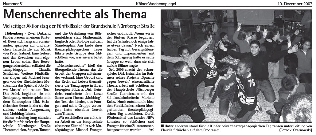 Bericht über einen theaterpädagogischen Tag in der Grundschule, Kölner Wochenspiegel, 09.12.2007